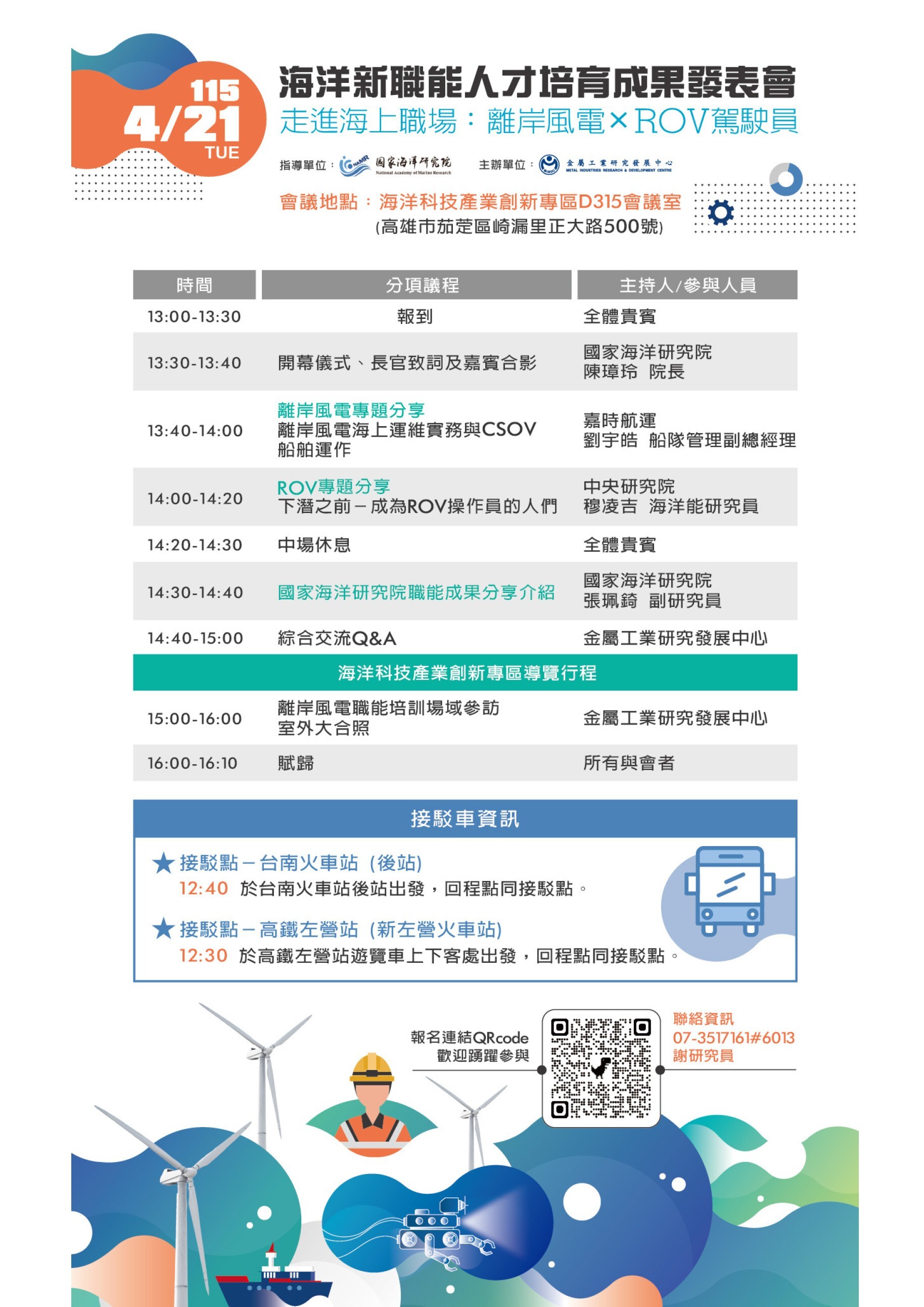 [產學組]轉知國家海洋研究院辦理「海洋新職能人才培育成果發表會-走進海上職場:離岸風電×ROV駕駛員惠請協助轉知所屬學校師生踴躍參加,請查照。